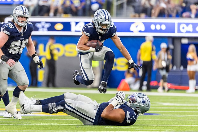 Dallas Cowboys cornerback Caelen Carson leaps in the air in an NFL match | Image Credits: IMAGO/Zuma Press Wire