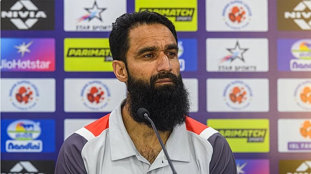 Mehrajuddin Wadoo addressing a press conference from when he was the interim head coach of Hyderabad FC (Source: ISL)