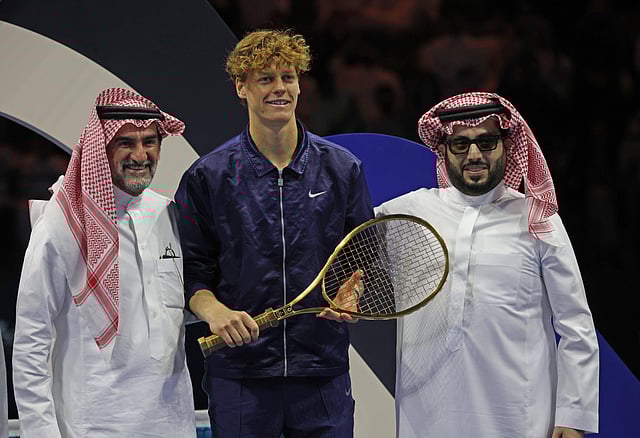 Jannik Sinner (middle) with the 'Golden Racquet' after his win in Riyadh | Image Credit: IMAGO / Independent Photo Agency Int.